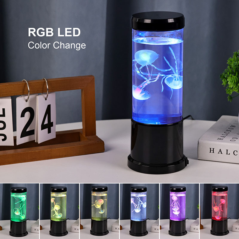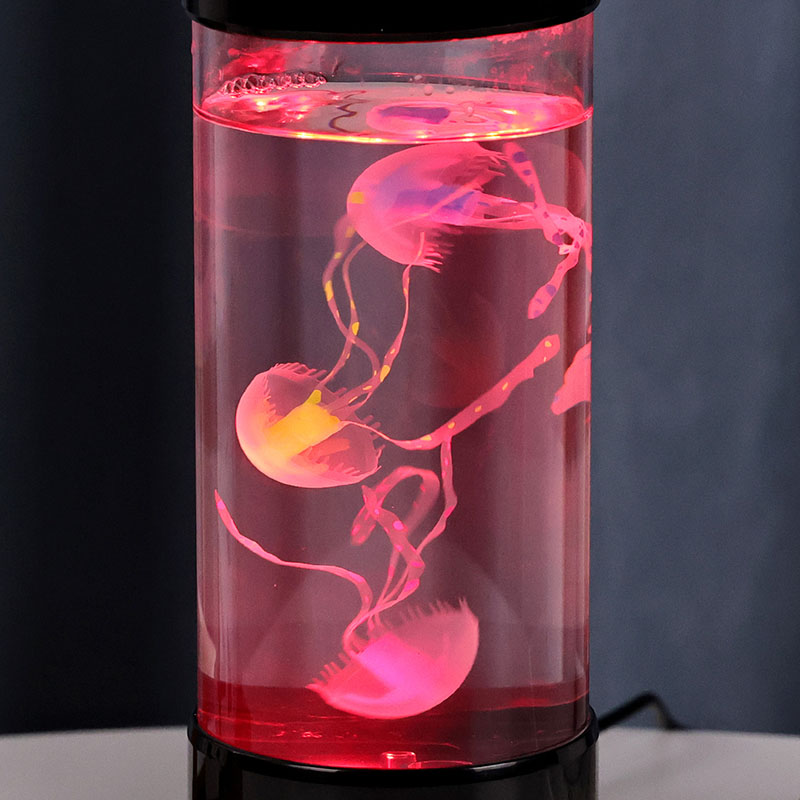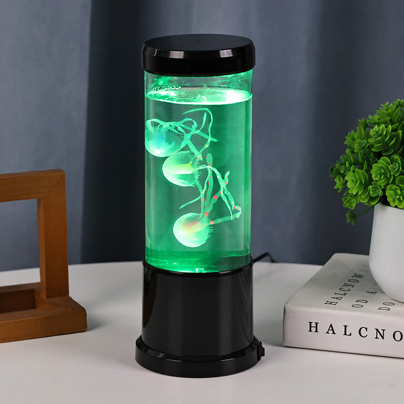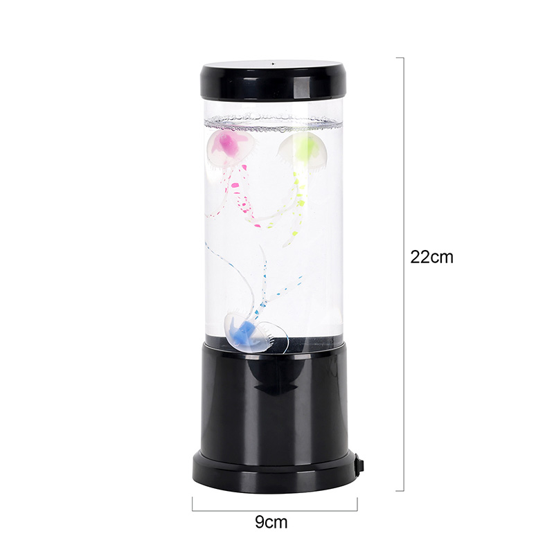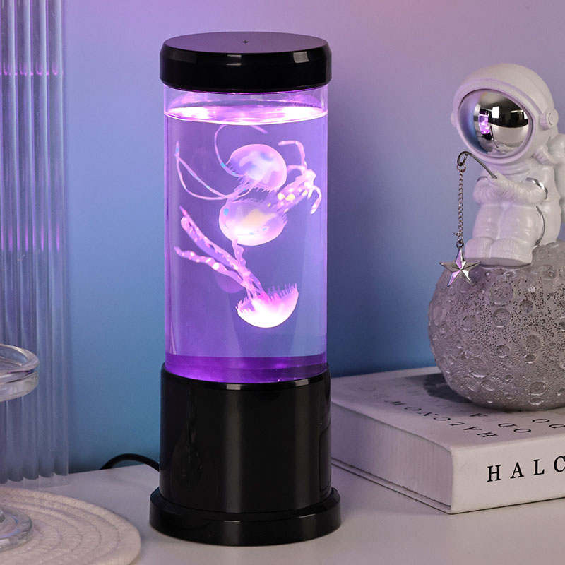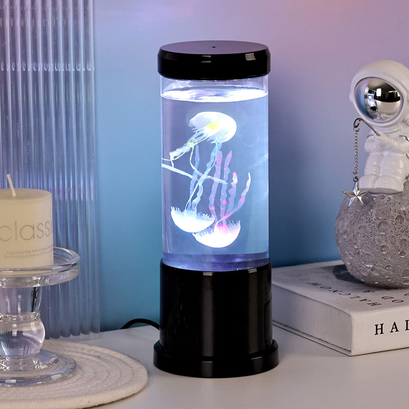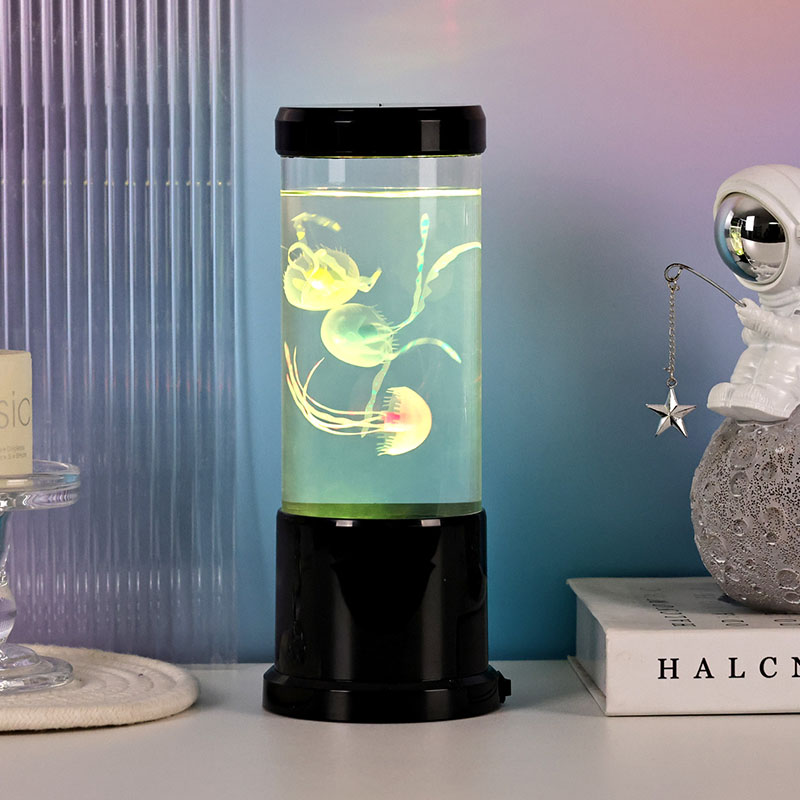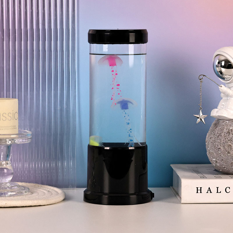 лампа има реалистичну медузу у црној нијанси која нежно лебди унутар прозирног цилиндричног резервоара, стварајући умирујући подводни амбијент који претвара сваку просторију у спокојно океанско уточиште.