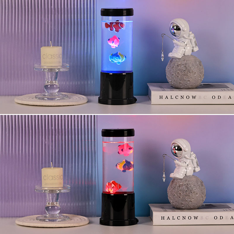Права магија лежи у осветљеном резервоару, где вештачке медузе грациозно клизе у течности попут воде, покретане уграђеним системом за циркулацију. Ове прозирне медузе су замршено дизајниране са блиставим пипцима и меким, пулсирајућим телима која опонашају природно кретање правих морских створења. Динамично осветљење појачава овај ефекат, бацајући етерични сјај на вашу околину.