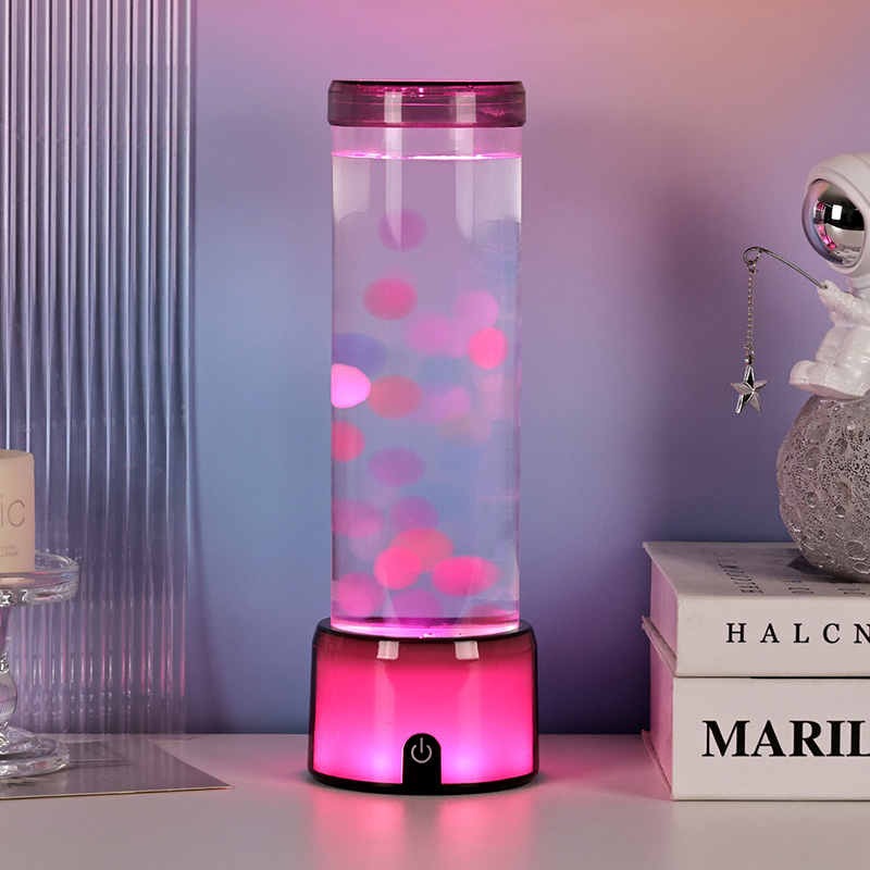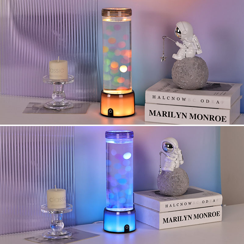 Израђена с пажњом на детаље, ова лампа опонаша изглед правог акваријума са својим провидним цилиндричним телом испуњеним бистром течношћу и светлећим фигурама медуза које грациозно лебде унутра. Меки сјај унутрашњег ЛЕД система побољшава кретање медузе, стварајући задивљујући ефекат бокеха који подсећа на биолуминисцентна створења која плутају у дубоким водама. Без обзира да ли је постављена на ноћни ормарић, радни сто, полицу или сто у дневној соби, ова лампа додаје дашак елеганције и чуда сваком окружењу.