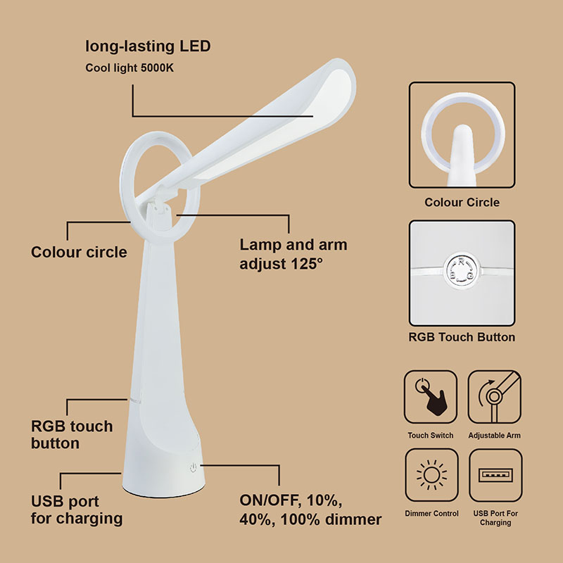 Декор ргб лед столна лампа може 3 пригушити назад на телу производа. Глава лед светла може да се отвори за 125°мак.