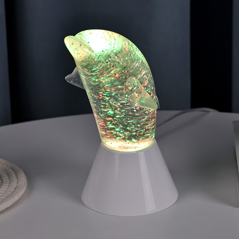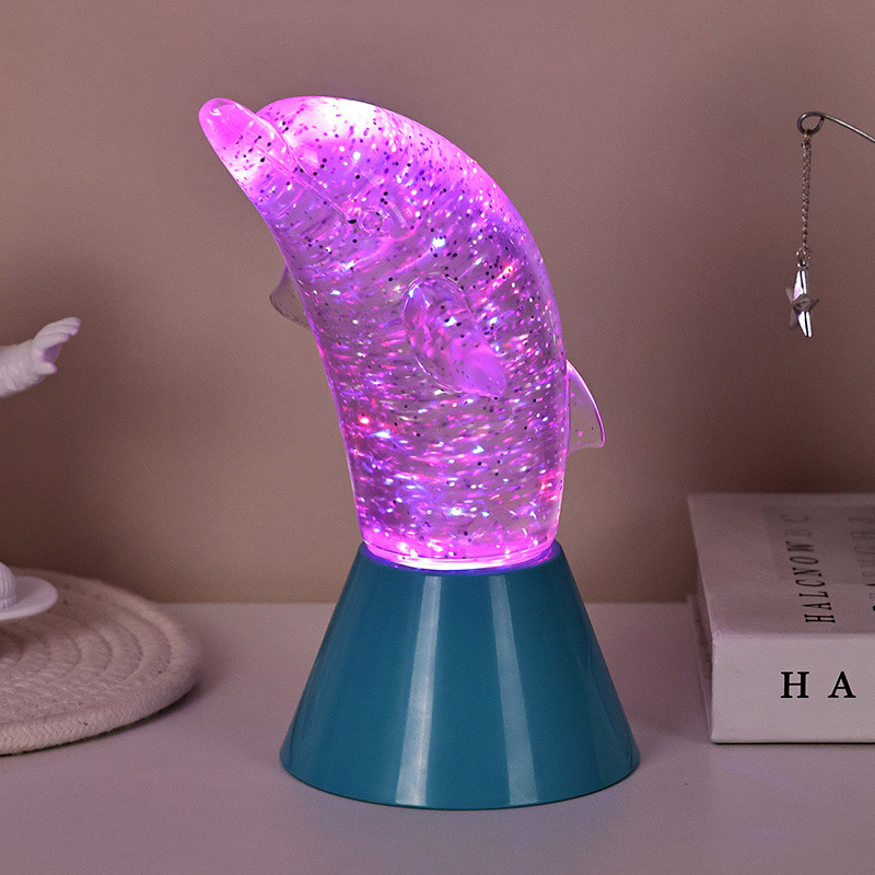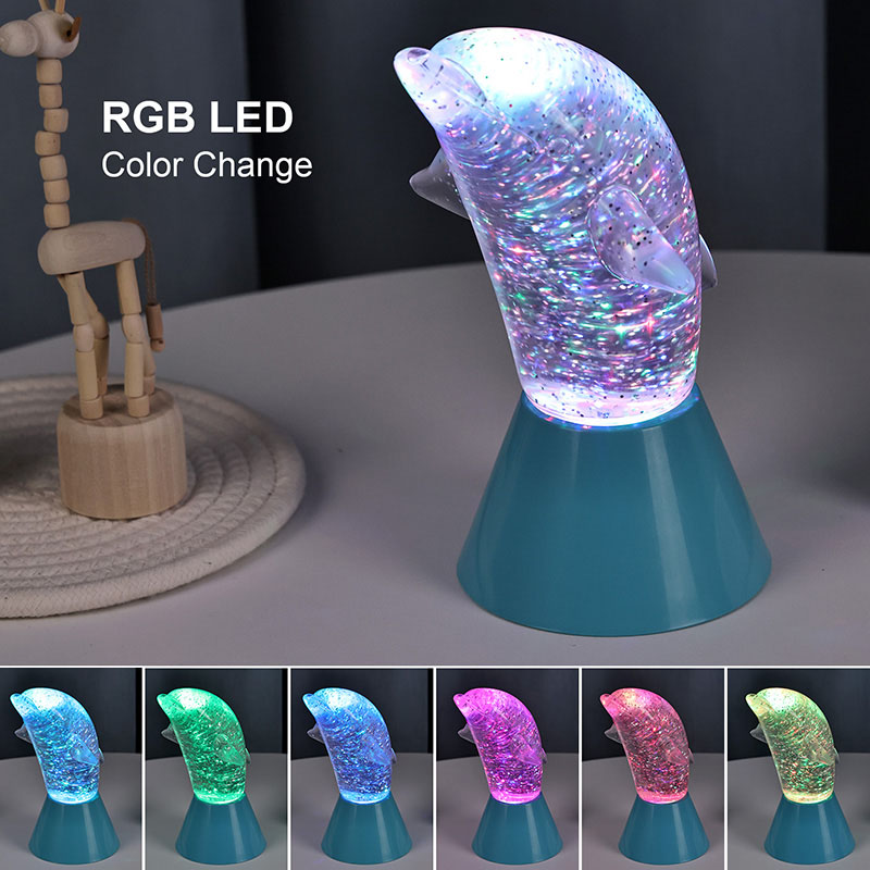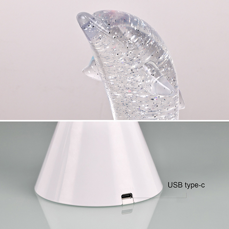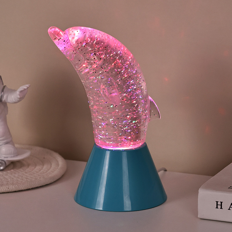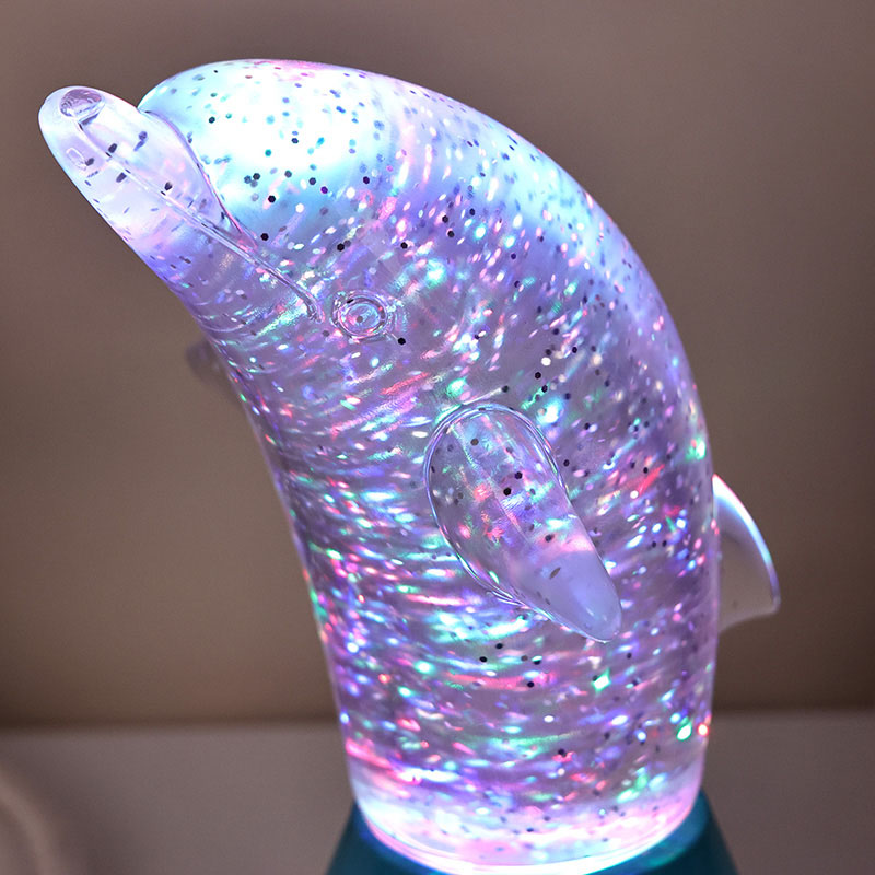 Долпхин Кид Гифт Глиттер РГБ Нигхт Лигхт је дизајниран у облику слатког делфина, са глатким линијама и изузетним детаљима који савршено враћају агилно држање делфина. Унутар провидне љуске делфина, у облику шљокица. Неправилни покрети могу лепо да рефлектују боје, стварајући мирну и мистериозну атмосферу. Сваки пут када погледате у ову лампу, осећате се као да сте у дубоком океану. Међу њима осетите бескрајни шарм природе Опремљен напредном РГБ технологијом осветљења која мења боју, омогућавајући вам да слободно прелазите са једне на другу боју. Било да је топла наранџаста, романтична ружичаста или мирна плава,