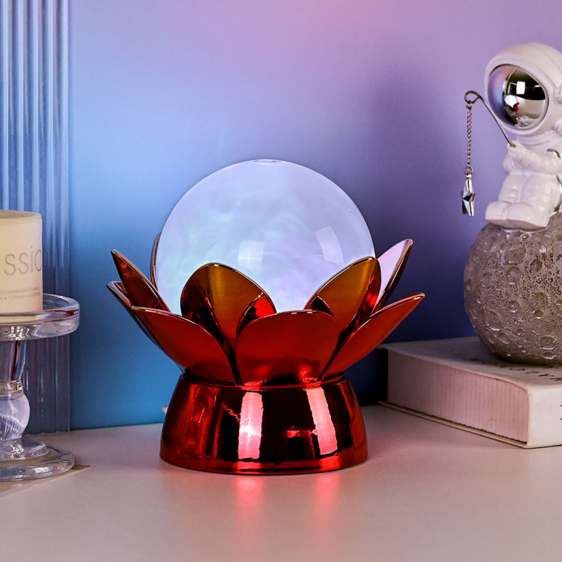 Очаравајућа ноћна лампа Лотус Цлоуд Глобе – очаравајућа фузија дизајна инспирисаног природом, умирујућег амбијента и модерне технологије. Ова елегантна декоративна лампа има прозирну стаклену куглу испуњену посебном течношћу која симулира лебдеће облаке, стварајући миран, етерични ефекат док се нежно врти и тече. Инспирисана светим лотосовим цветом, ова ноћна лампа почива на прелепо израђеној металној основи у облику расцветаних латица лотоса, симболизујући чистоћу, мир и духовно буђење.