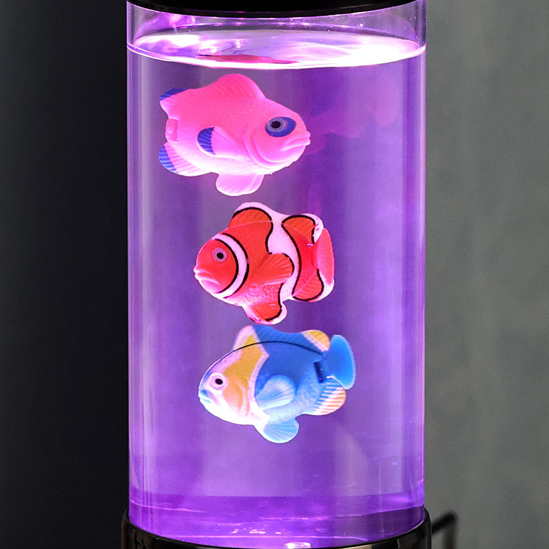 Унутар прозирног резервоара, реалистичне вештачке рибе грациозно клизе горе-доле у синхронизацији са благим млазовима мехурића који се дижу са дна. Ове дивно детаљне рибе, дизајниране са живим бојама и реалистичним текстурама, изгледају као да пливају природно јер их носи мека струја коју ствара уграђена ваздушна пумпа. Покрет је умирујући и хипнотичан, стварајући умирујуће визуелно искуство које помаже у смањењу стреса и подстиче опуштање.