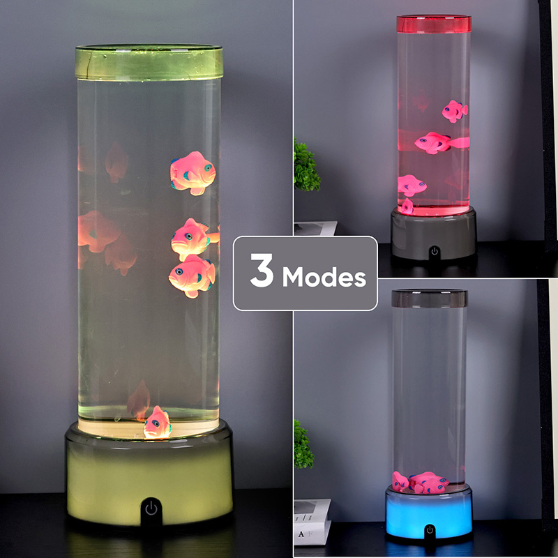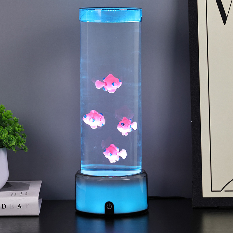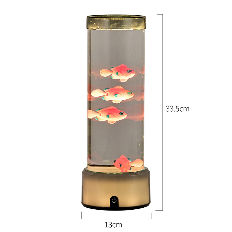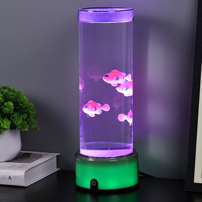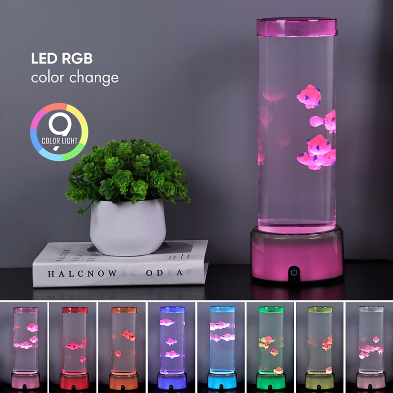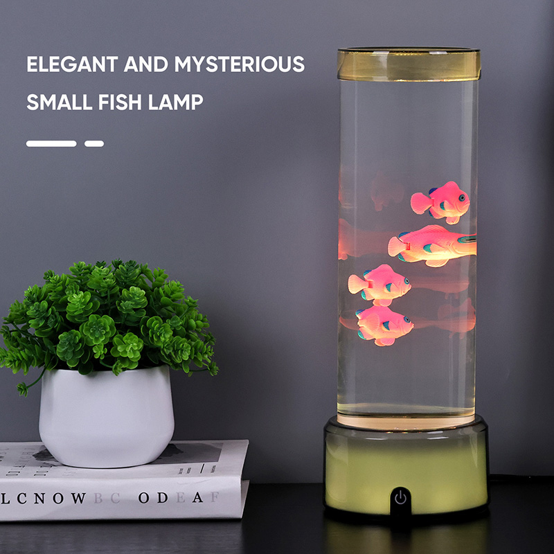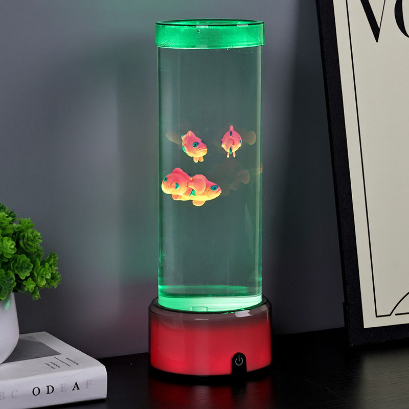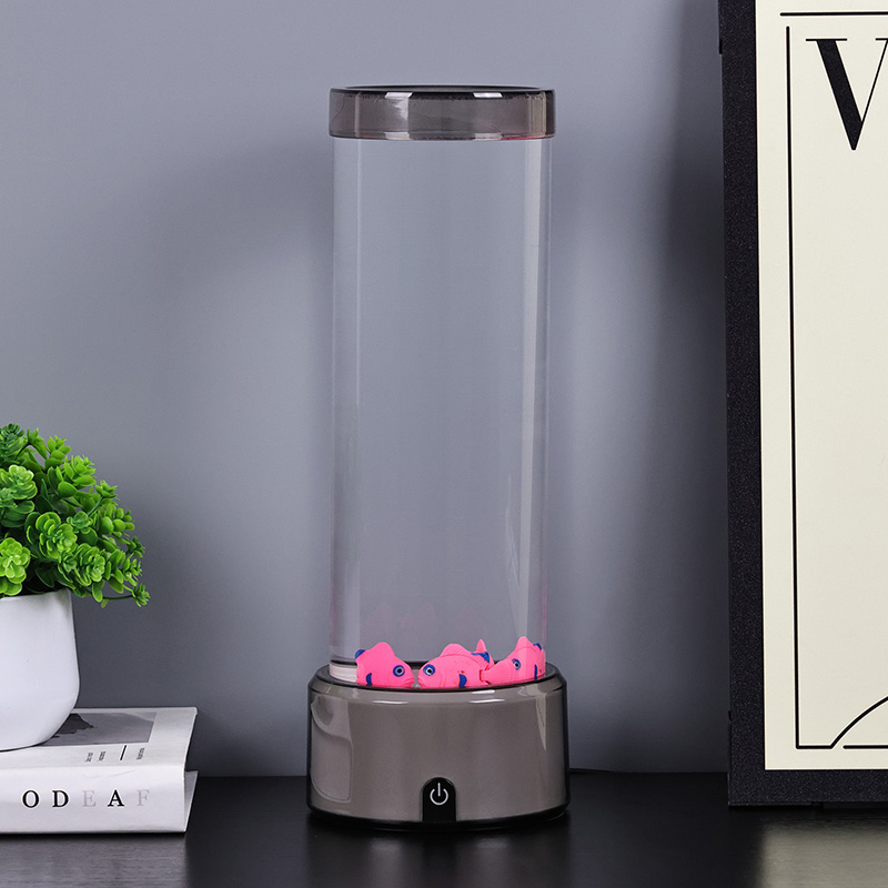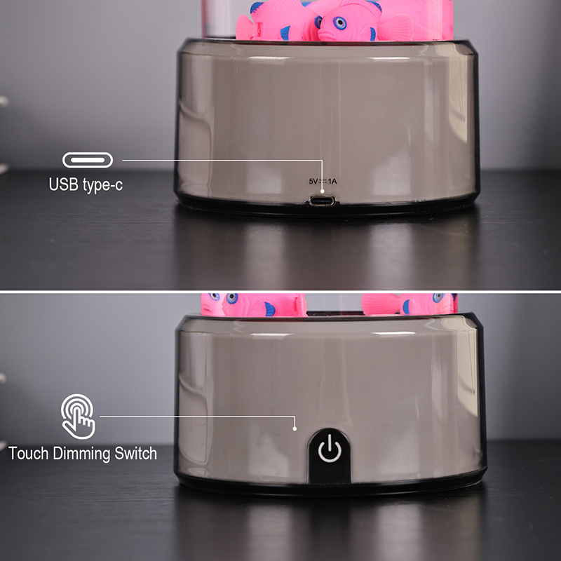 Прекидач за избор додиром и пливање медузеЛампа медуза са РГБ основном декоративном лампом, новодизајнирана дечија играчка за гледање са цилиндричним дизајном за задржавање воде. Након пуњења водом, унутра се стављају три мале рибе. Лампа медуза са РГБ базом може да плива горе-доле када се мали мотор на дну окреће. У исто време, база има РГБ трансформацију боја. Највећи врхунац овог производа је да се база такође мења са трансформацијом боје. Потпуно пластични дизајн је веома лаган без задржавања воде, што је веома погодно за транспорт. Извор напајања рибље лампе је УСБ тип Ц ниског напона, што је веома згодно