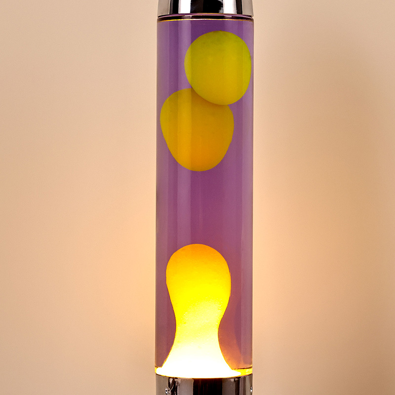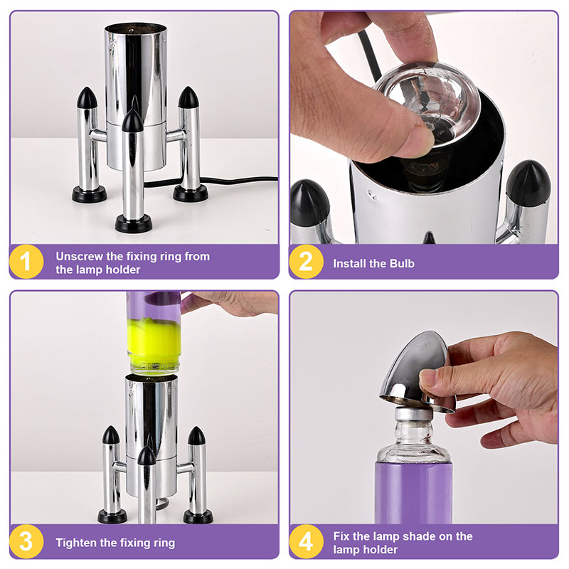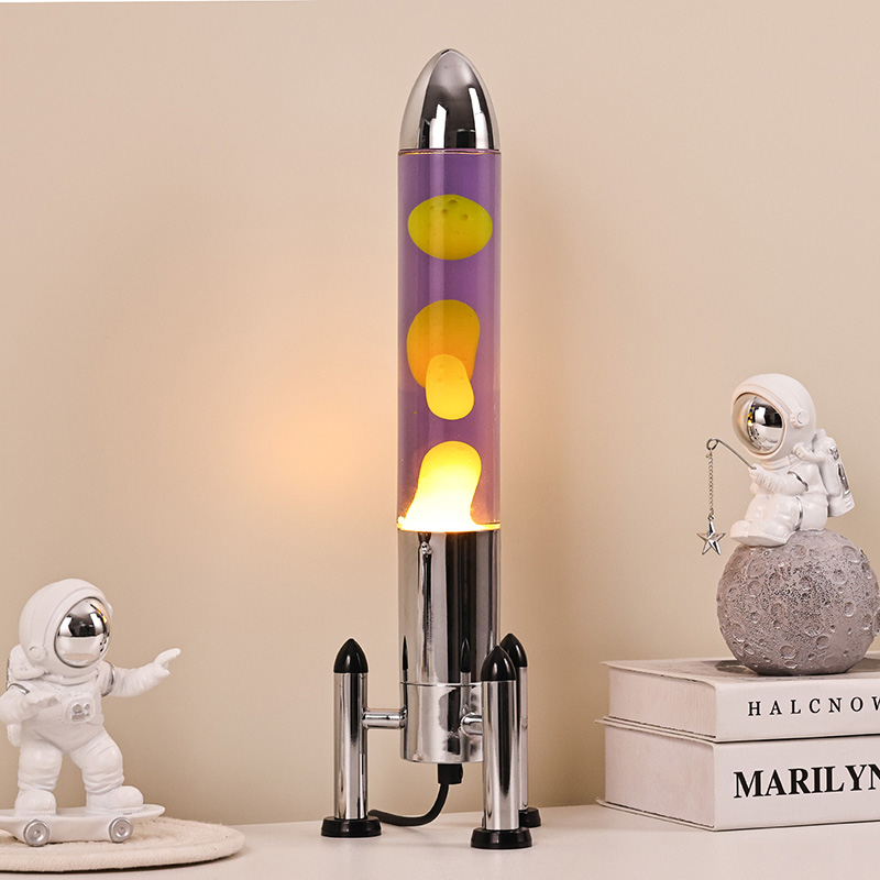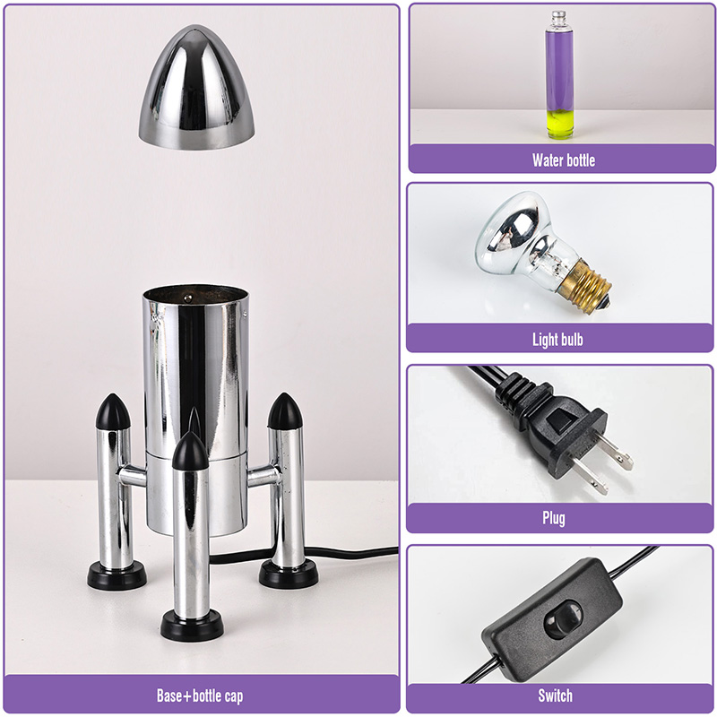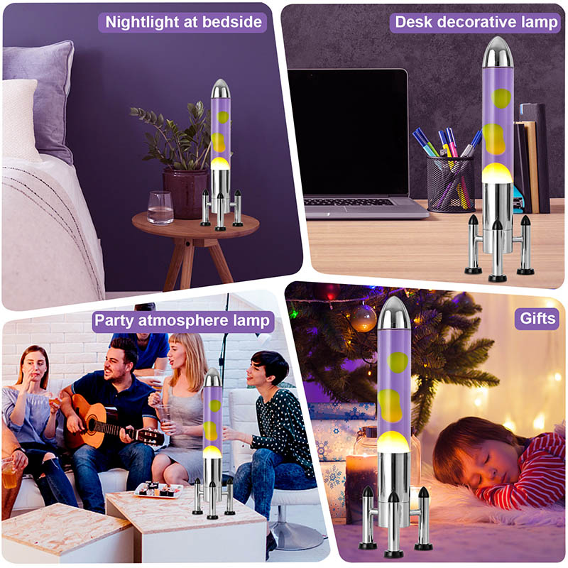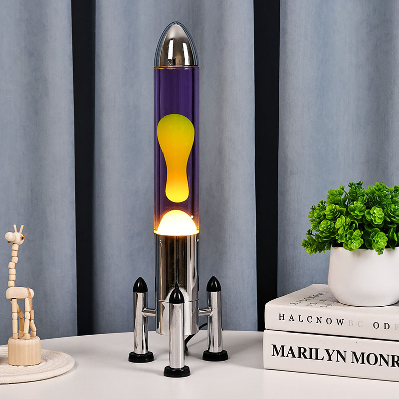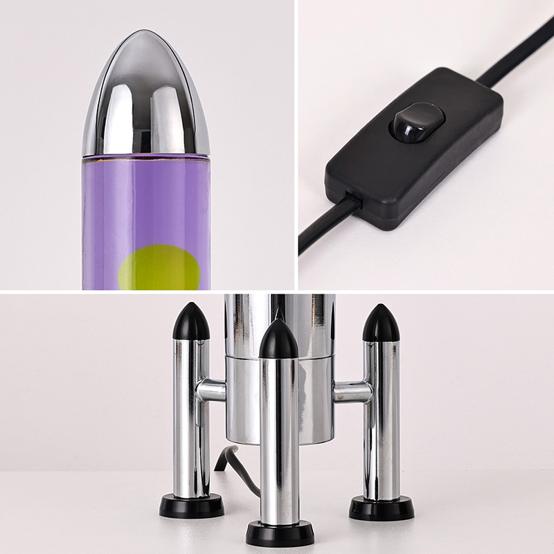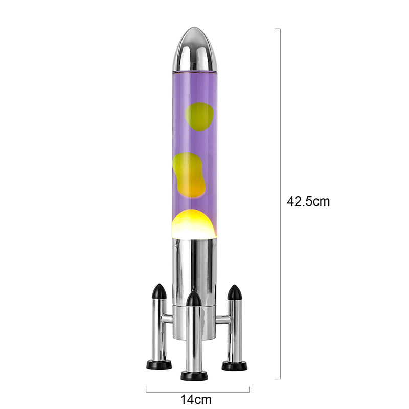 24ВВелика ЛЕД Лава лампа са ракетним абажуром има класични дизајн у облику ракете, са сребрном металном шкољком упарена са провидним телом стаклене боце, једноставна, али модерна. Жута плута у љубичастој течности унутра