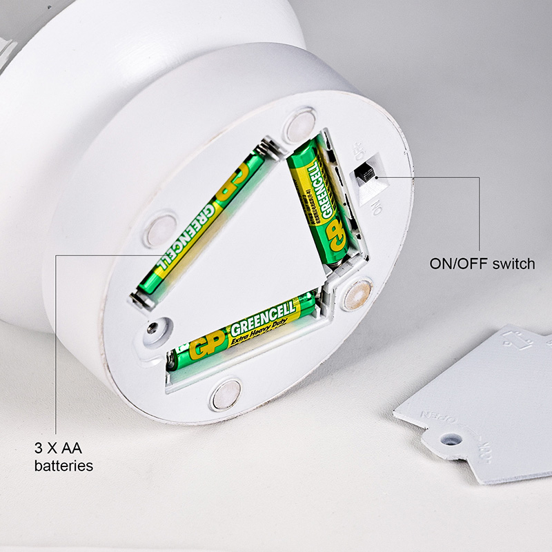 Нема потребе за укључивањем; може се напајати са само 3 ААА батерије, са једноставном инсталацијом и флексибилном употребом. Било да се постави на ноћни ормарић, радни сто, креветац за бебе или да се однесе на камповање
