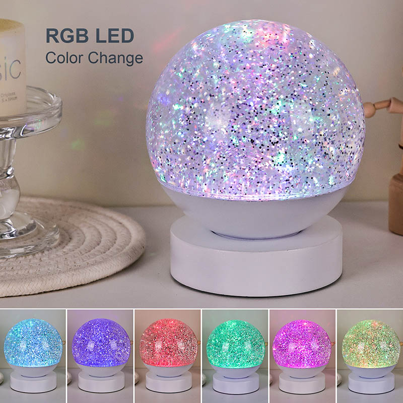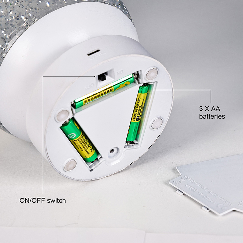 Лед РГБ Глиттер Децор лампа је направљена од висококвалитетног акрилног материјала, са провидном сфером са одличном трансмисијом светлости. База је израђена од еколошки прихватљиве АБС пластике, која осигурава стабилност, издржљивост и сигурност без токсичних супстанци. Ради на три уграђене ААА батерије (батерије се продају засебно), елиминишући потребу за утичницом и нудећи згодну употребу. Савршено за постављање поред кревета, радног стола или у кутку за дечије играчке. Са једноставним прекидачем на додир, светло се може лако укључити или искључити, што га чини лаким за употребу чак и за децу да самостално раде.