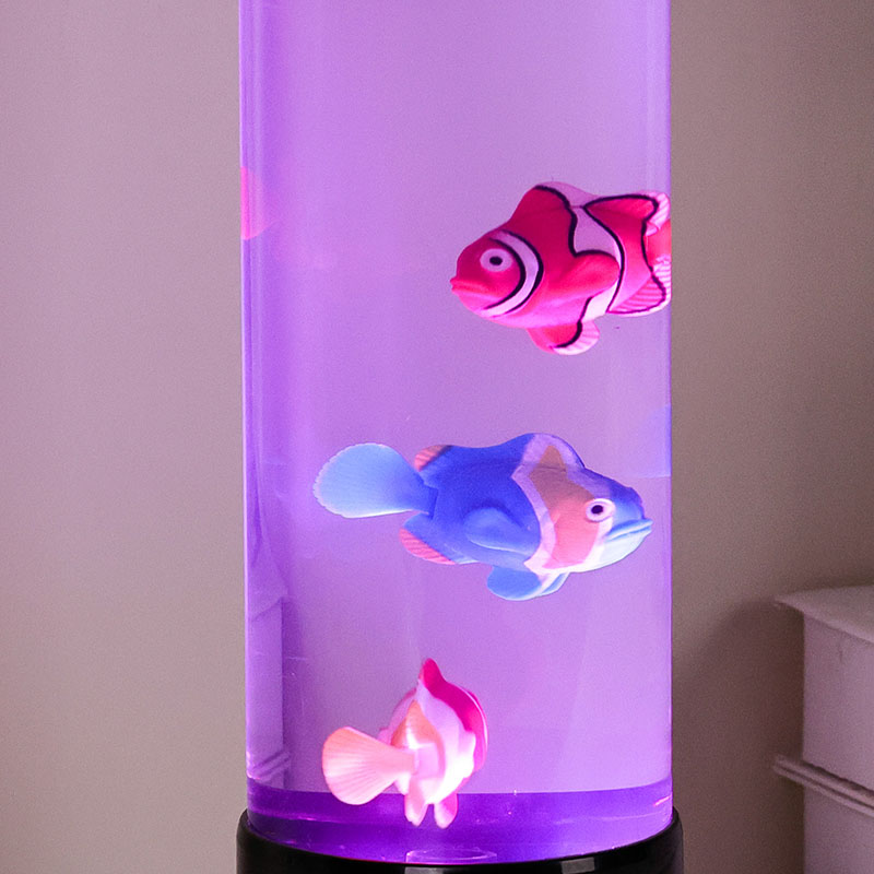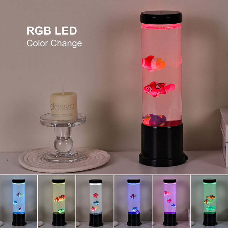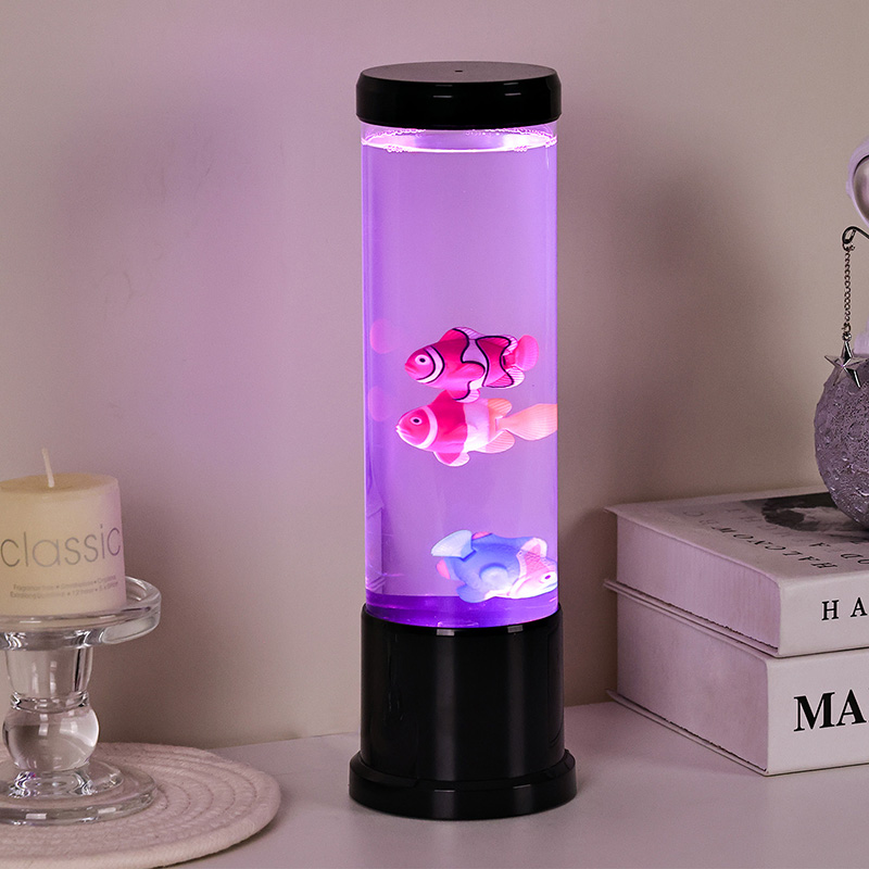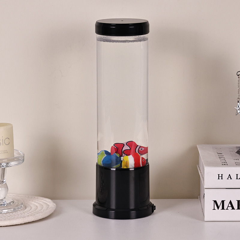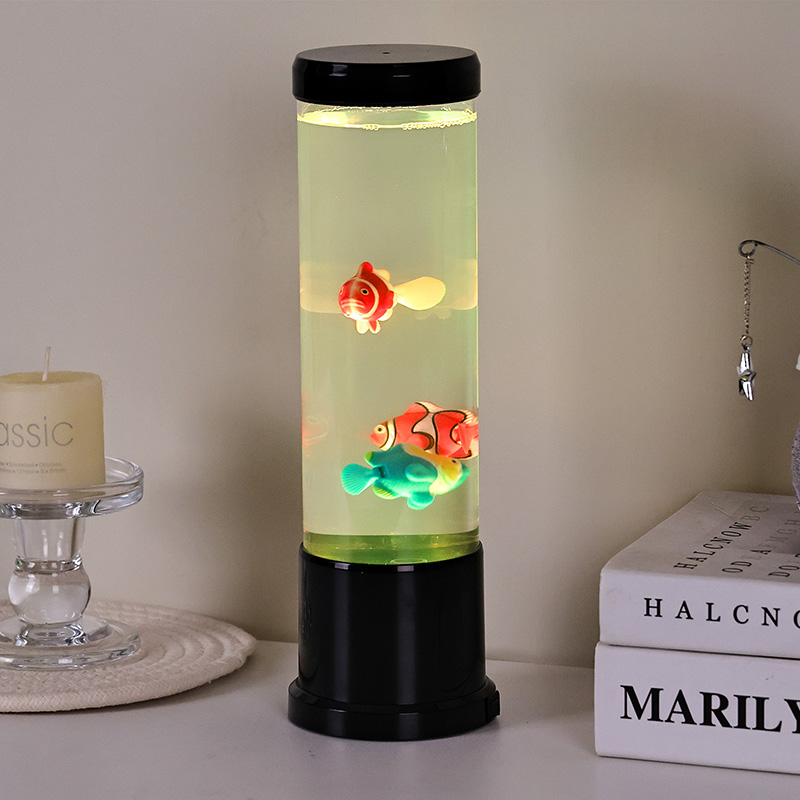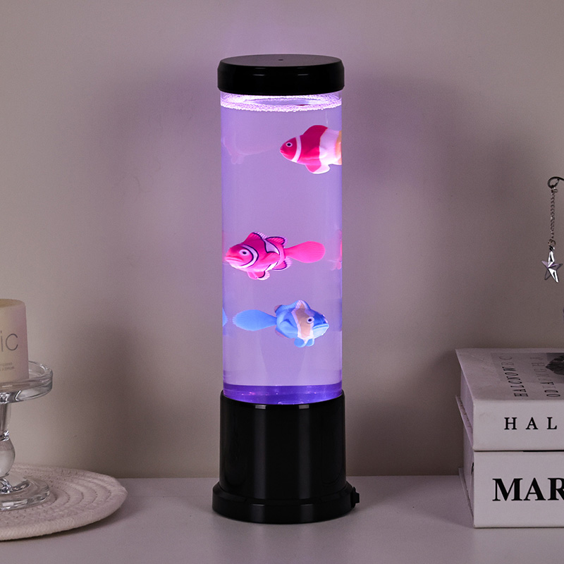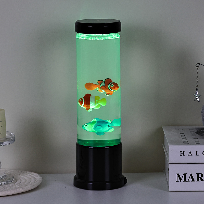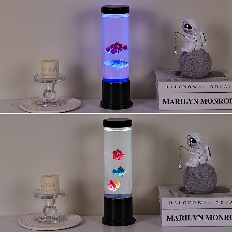 У срцу ове лампе је пажљиво израђена симулација правог акваријума. Унутар прозирне колоне, наћи ћете предивно детаљне, плутајуће фигуре риба - као што су живахне рибе кловн и друге тропске врсте - које се нежно крећу и пливају кроз течност налик води. Додатак блиставих медуза појачава магичну подводну илузију, нежно пулсирајући етеричним светлом. Комбинација покрета и боја ствара динамичну сцену која привлачи пажњу и уноси мир у ваше окружење.