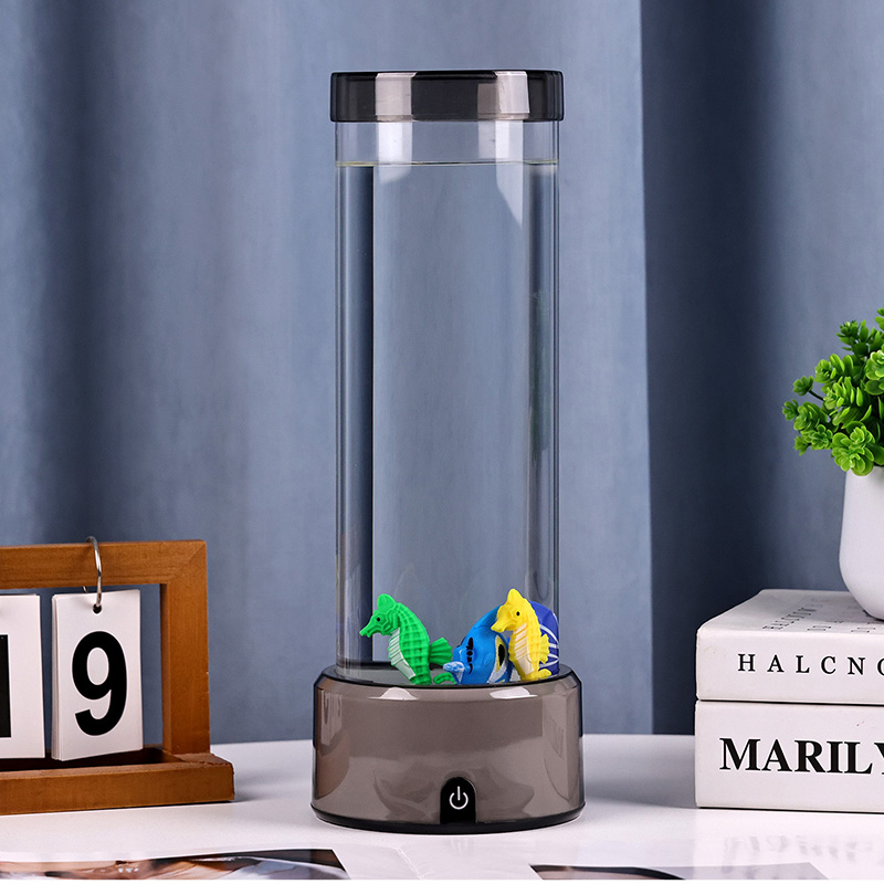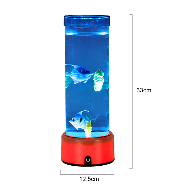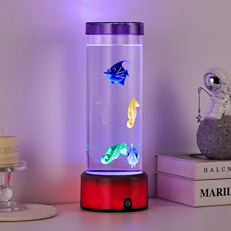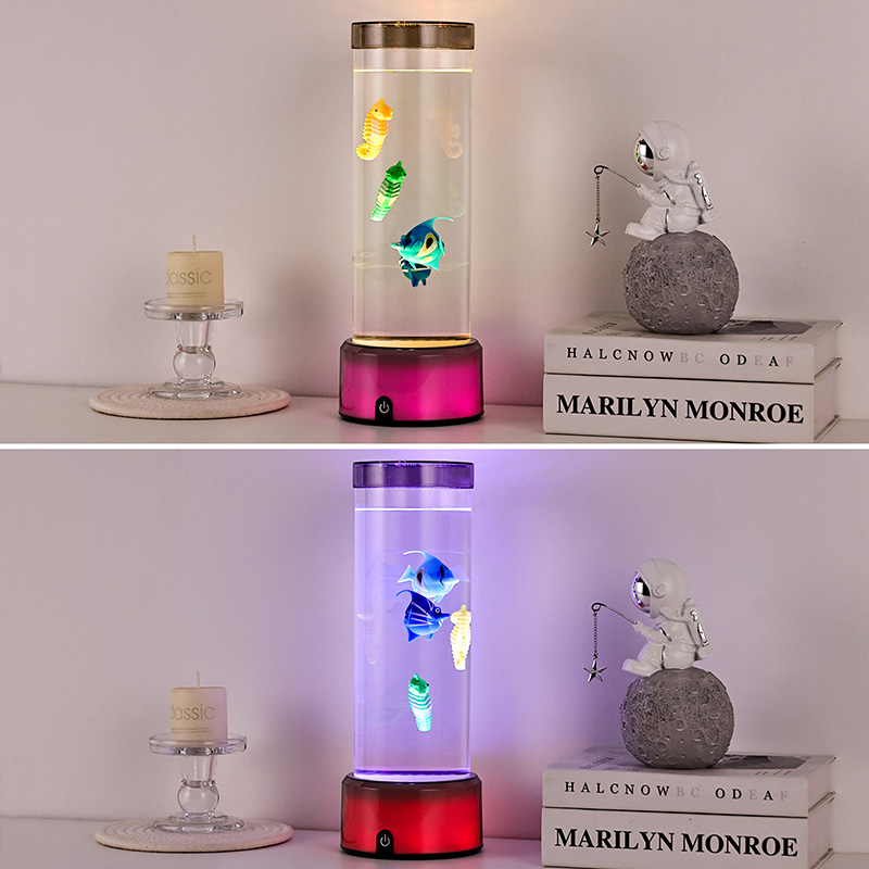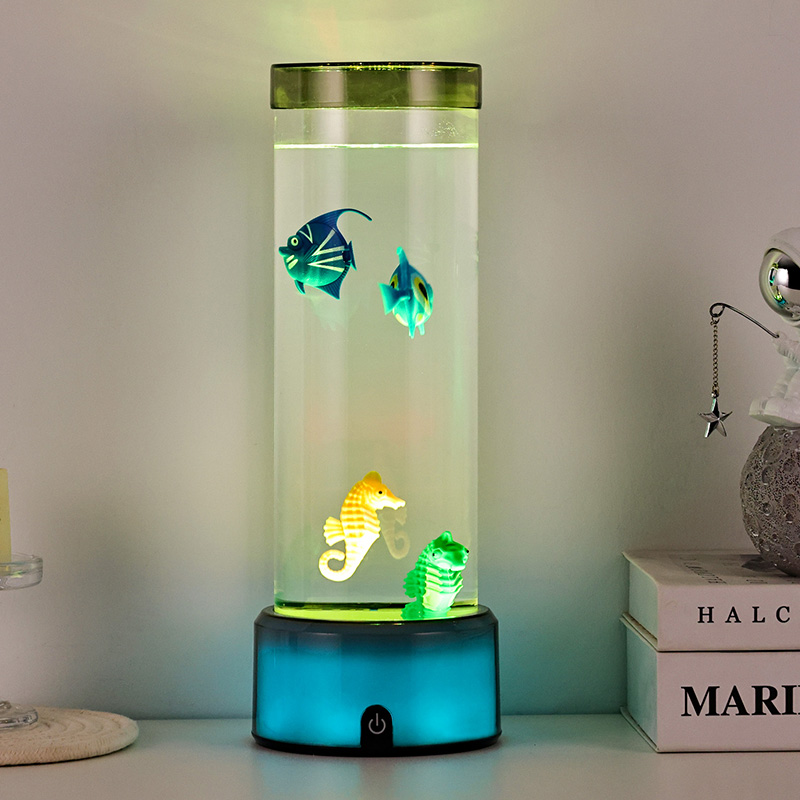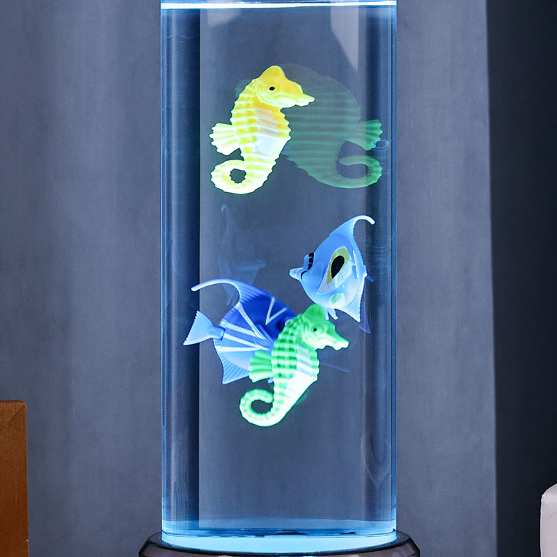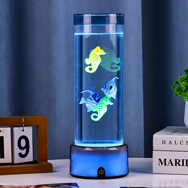 шарм. Израђена од висококвалитетне, издржљиве пластике, ова задивљујућа лампа има елегантно цилиндрично тело испуњено бистром течношћу и предивно детаљним плутајућим фигурама риба — укључујући живописне тропске рибе и шармантног морског коњића — стварајући спокојан, реалистичан океански призор који доноси спокој и визуелни ужитак у сваку просторију.