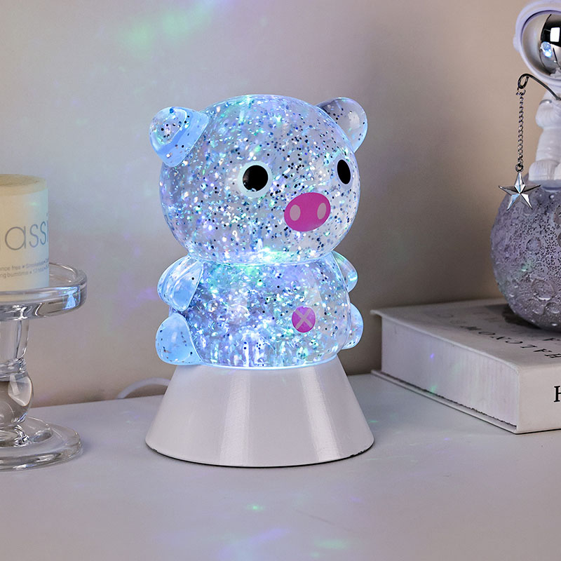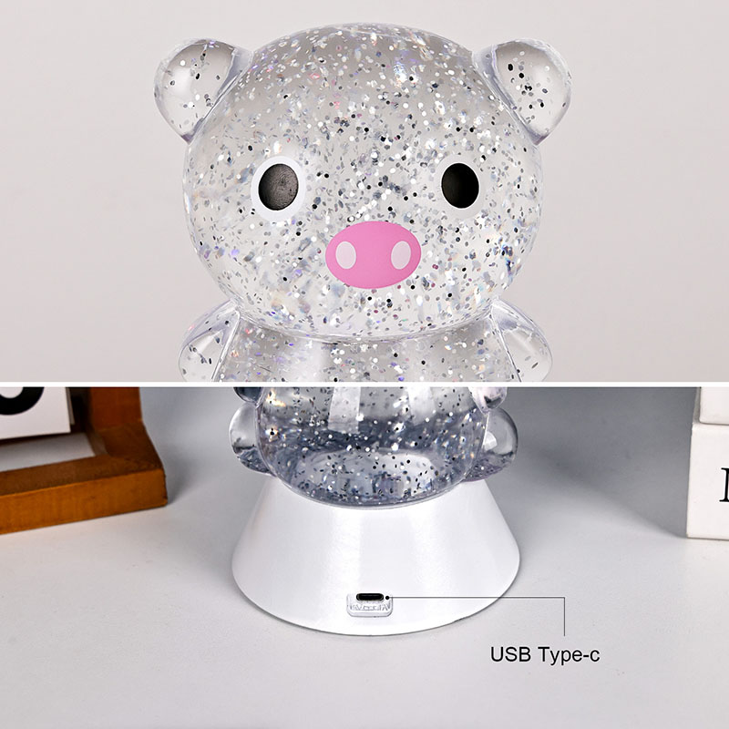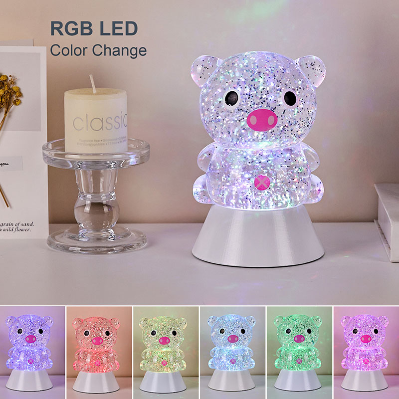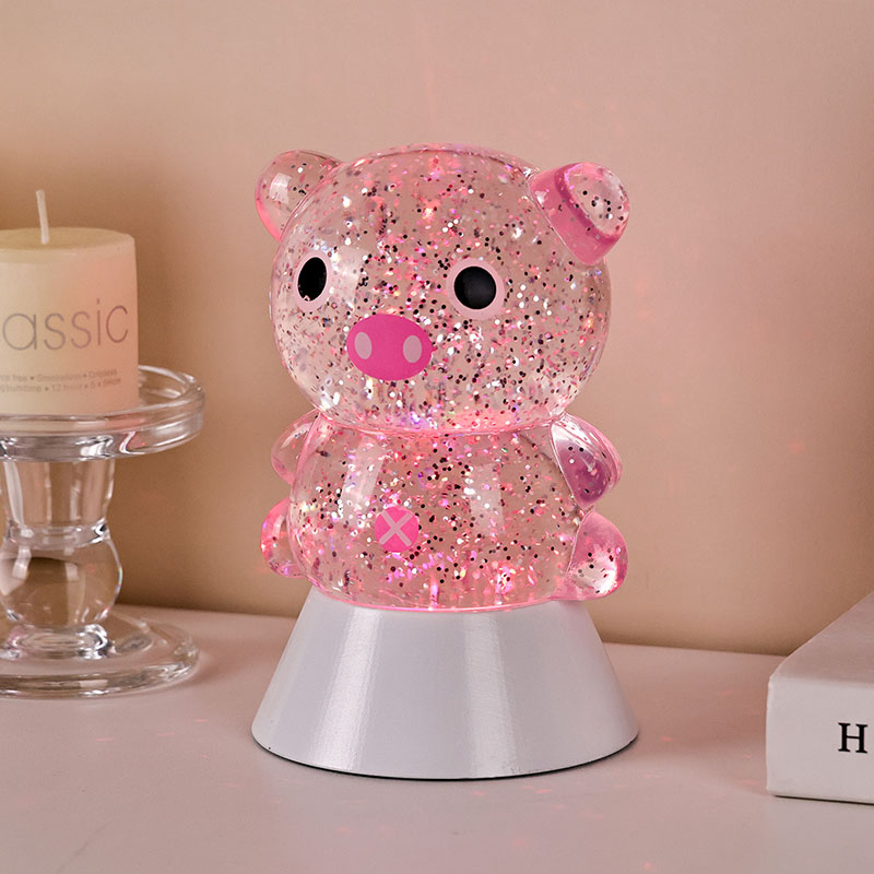 Целокупни дизајн има слатку и симпатичну слику прасића, са својим округлим и дебељушкастим контурама упареним са великим очима, ружичастом њушком и љупким малим ушима, тренутно освајајући срца и одраслих и деце. Прозирна шкољка од смоле испуњена је светлуцавим шљокицама и специјалном течношћу, која нежно тече са течношћу када су светла укључена, стварајући сањив визуелни ефекат попут звездане реке која тече унутар тела свиње. Светле боје се аутоматски мењају, прелазећи од нежно розе и сањиве љубичасте до свеже плаве и зелене, непрестано се мењајући у дугину боју која ствара мирну, али магичну атмосферу, као да претвара свет бајке у стварност.