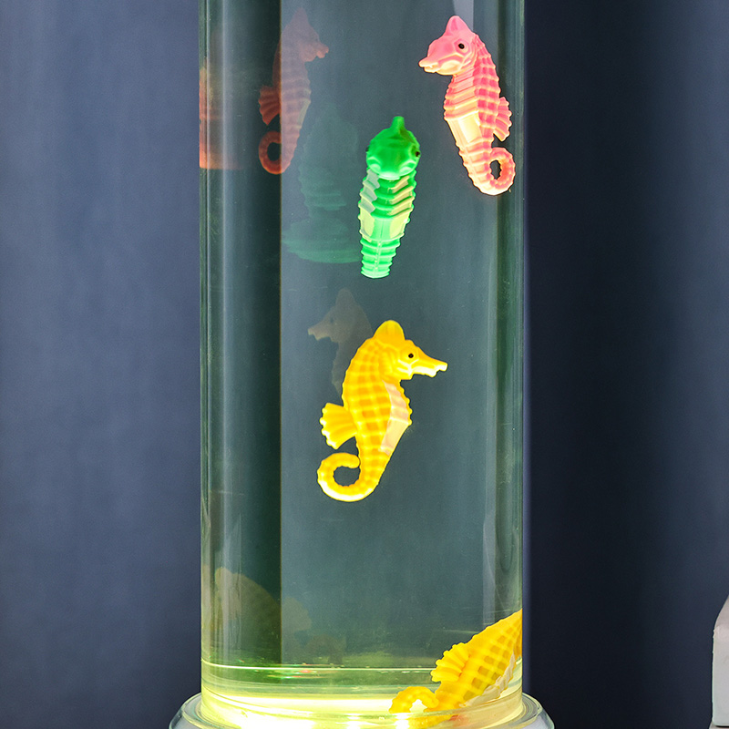 очаравајућа подводна сцена која дочарава мир океана. Цела јединица је направљена од висококвалитетне издржљиве пластике која обезбеђује сигурност стабилности и дуготрајне перформансе. Лампа је висока око 12 инча са елегантном провидном цеви испуњеном нетоксичном течношћу и шареним орнаментима морског коњића. стуб течности покретан тихим системом унутрашње циркулације који ствара природно љуљање које подсећа на прави морски живот. Овај нежни покрет је умирујући за гледање и помаже у смањењу стреса док пружа умирујуће визуелно искуство